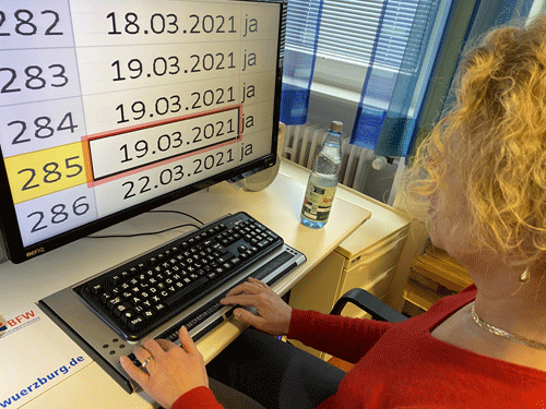 Typischer Blinden/Sehbehindertenarbeitsplatz: Vergrößerte Schrift auf dem Bildschirm, normale Tastatur und Braillezeile, die den Bildschirminhalt in Brailleschrift zeigt. Dazu gehört noch eine Sprachausgabe, die das Ganze auch vorliest. |