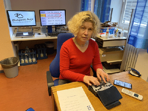 Auf diesem Bild sehen Sie Silvia Schäfer im Büro der TIBS und der BG Hanau. im Hintergrund 2 Bildschirme: Auf dem Tisch vor Silvia liegt ein spezieller Organizer für Blinde mit Brailletastatur und Braillezeile zum Lesen. Auch das iPhone ist mit seiner Sprachausgabe "Voice over" ein nützliches Hilfsmittel für Blinde. |
