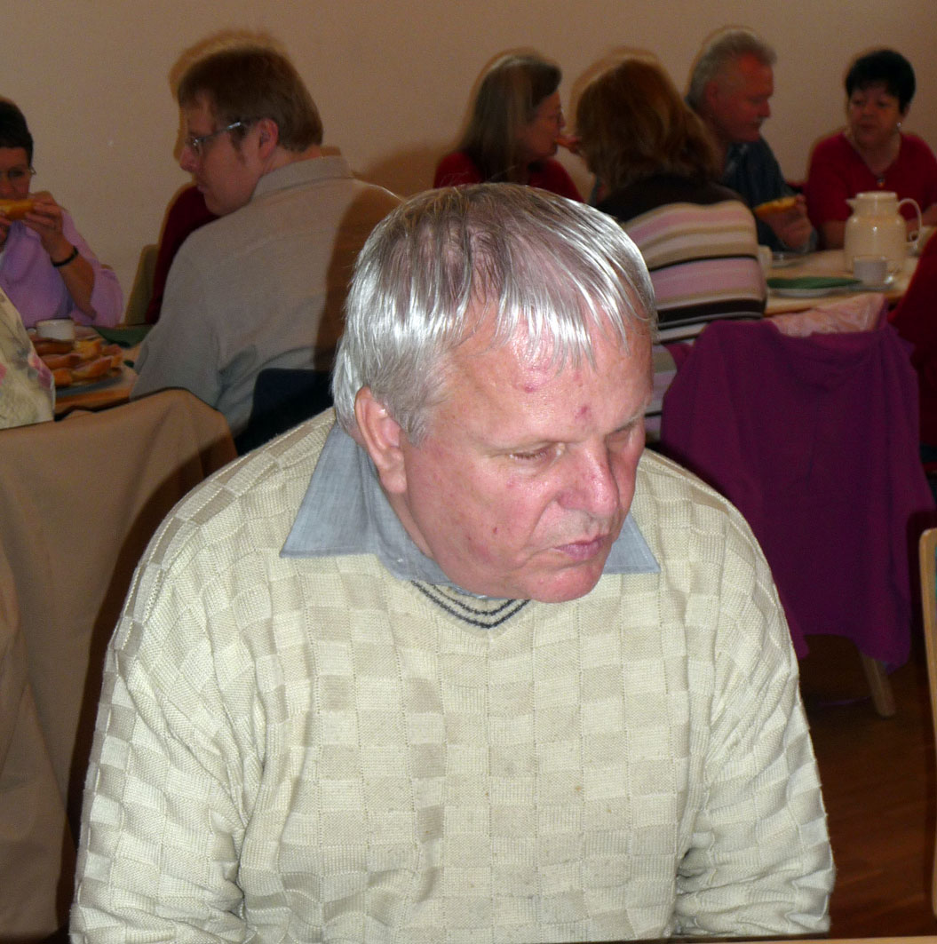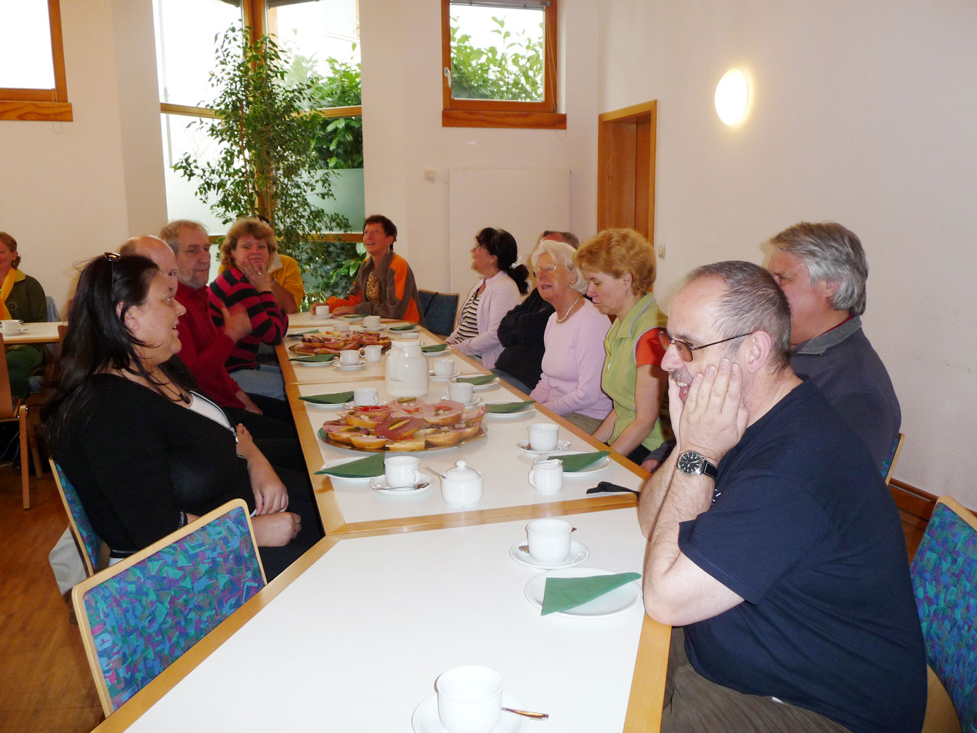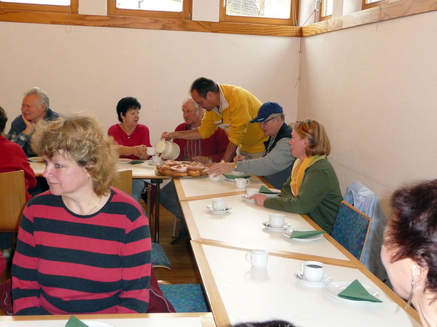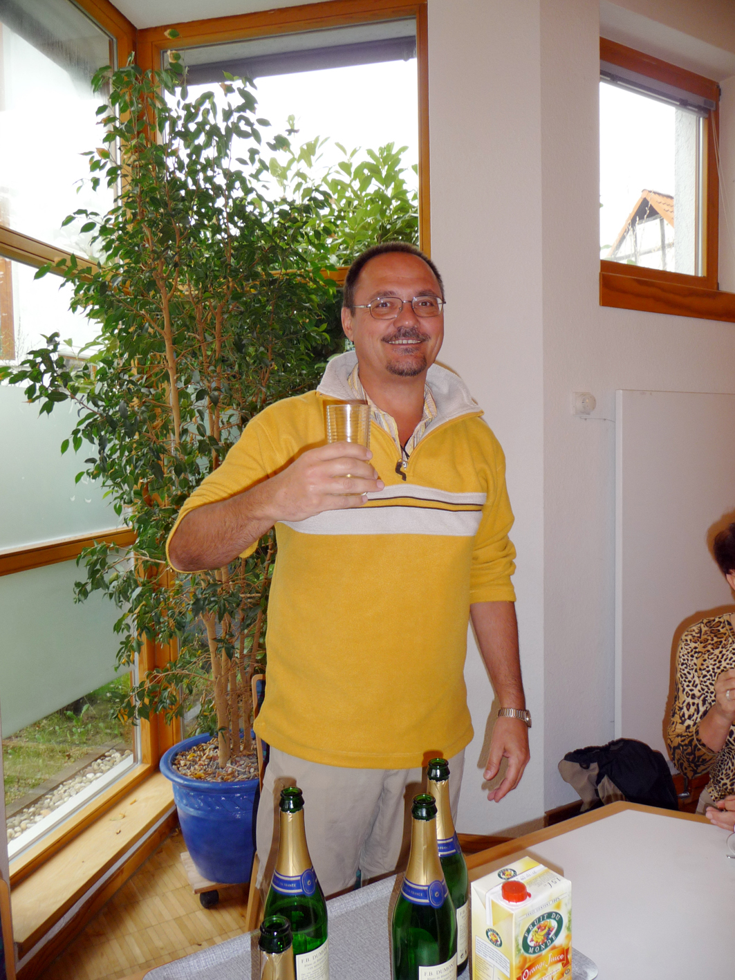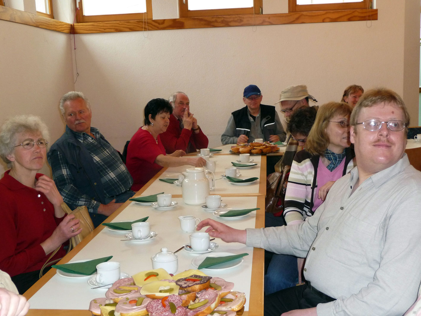 Treffpunkt für die Wanderung war der Bahnhof Langenselbold. Erster Programmpunkt war ein Frühstück, von Ruth und Jochen Marthiensen organisiert, im Jochen-Kepler-Haus, dem Gemeindehaus der evangelischen Kirche. Der neue Bezirksgruppenleiter Joachim Becker krönte das Frühstück mit einem Glas Sekt. Er selbst als Pfälzer hatte dabei, wie wir auf dem Bild sehen, das größte Glas. Dazu sagte er folgenden pfälzischen Trinkspruch: