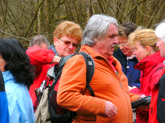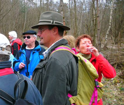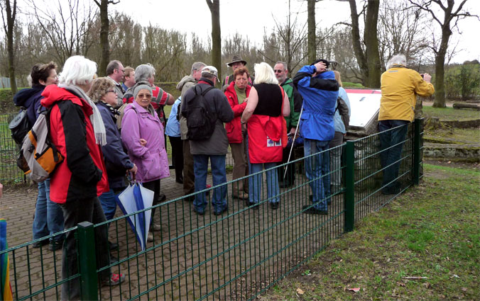 Die Schirme können trotz der schlechten Wettervorhersage geschlossen bleiben. Unterwegs gibt es dann noch eine kleine Stärkung, und hier ist jetzt auch einmal die Fotografin zu sehen, die sonst immer hinter der Kamera steht. In Rückingen, an den Ausgrabungen des römischen Bades, erhalten wir von Achim noch einige Informationen zum Limes, der von Krotznburg kommend quer durch die Bulau verlief und heute zum Unesco Weltkulturerbe zählt.