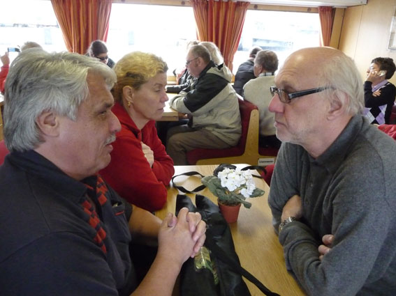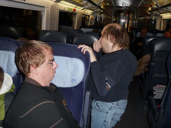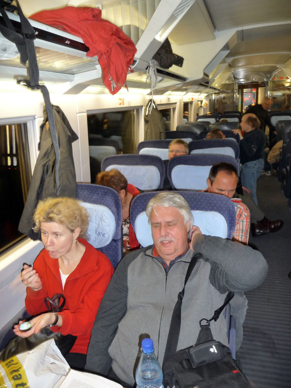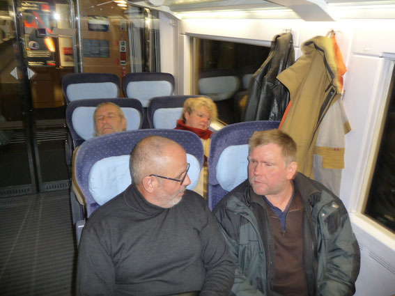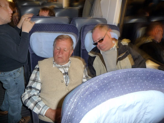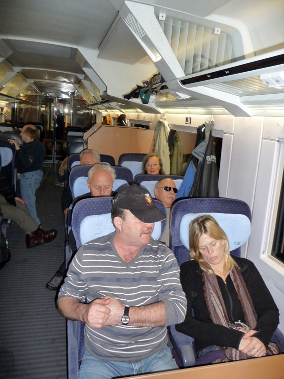 26 Mitglieder unserer Bezirksgruppe fuhren bereits um 5:20 Uhr vom Hanauer Hauptbahnhof ab. Darunter waren zahlreiche fördernde Mitglieder. Ihr Engagement ist besonders zu betonen, denn die Kürzung des Blindengeldes betrifft sie nicht. Auf den Bildern können Sie sehen, dass noch nicht alle ganz wach waren.