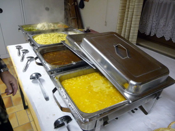 Von der "Gickelfarm" aus wanderten wir dann noch eine Stunde bis zum Wanderheim "Weinspechte" in Michelbach, wo es ein leckeres Mittagessen gab: Putengeschnetzeltes, Gulasch, Spätzle, Reis und gemischtes Gemüse. Wir wurden schon von einigen Teilnehmern erwartet, die direkt hierher gekommen waren. Nach soviel Essen war natürlich zur Verdauung ein Schnäpschen notwendig, Franz hatte einen leckeren Marillenbrand aus Österreich mitgebracht und Ingrid ihren köstlichen selbstgemachten Walnusslikör.