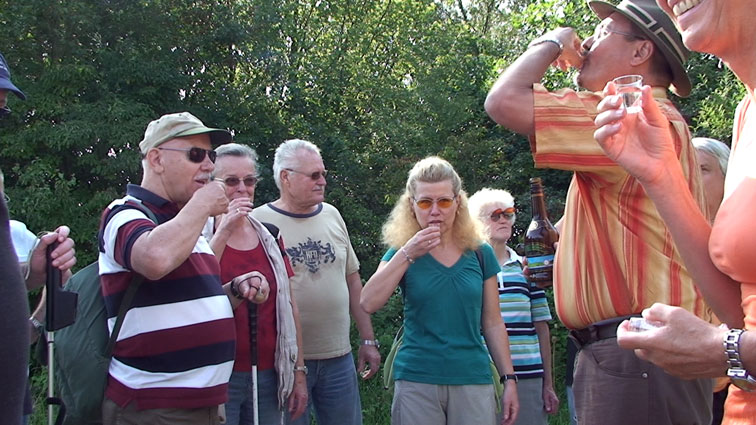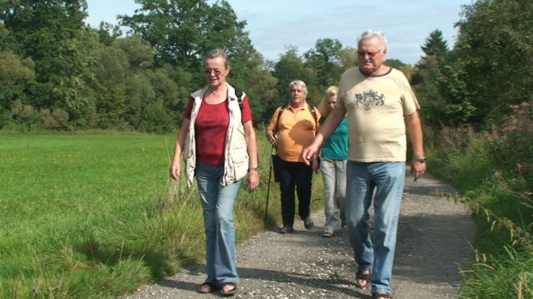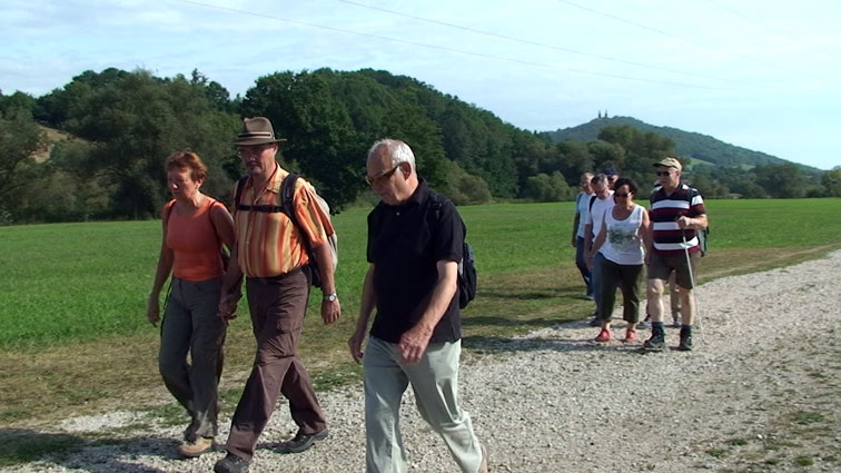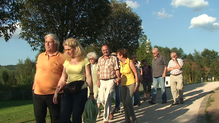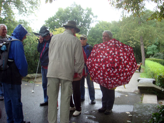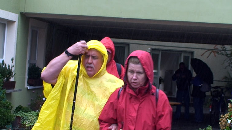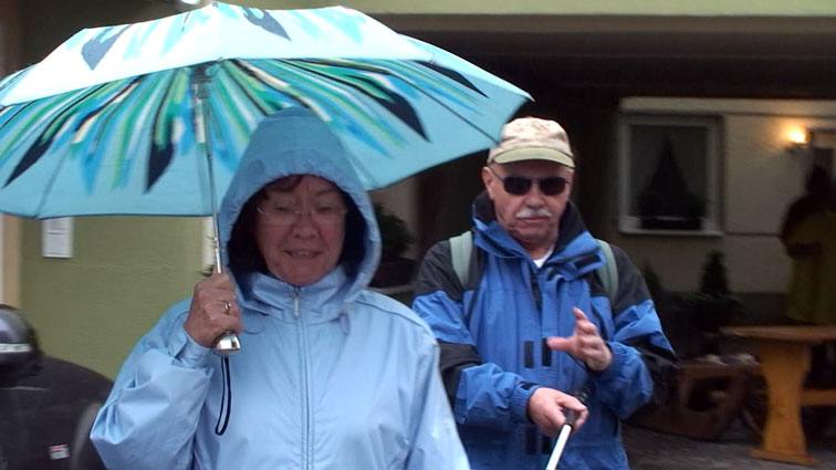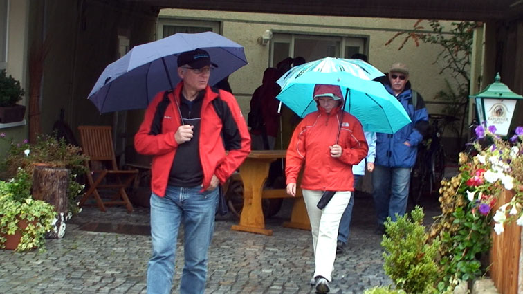Aber es herrscht nicht nur immer eitel Sonnenschein, am Mittwoch regnet es. Aber das hält einen echten Wanderer nicht davon ab, trotzdem loszuziehen, immer nach dem Motto: Es gibt kein schlechtes Wetter, es gibt nur falsche Kleidung. Außerdem haben die Pitschedabber bei Regen die große Möglichkeit, ihrem Namen gerecht zu werden. Aber es gelingt ihnen immer, nicht direkt in die Pfützen zu treten und das auch dank der zahlreichen Begleitpersonen, die sie geschickt um die Pfützen herumführen.
