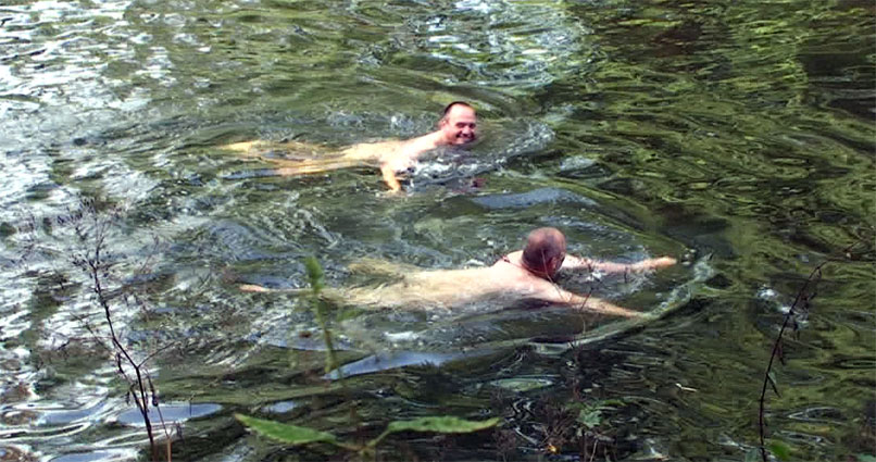 Am Sonntag ist es sehr heiß. Deswegen ist das Bedürfnis groß, sich nicht nur "innerlich" abzukühlen. Auch eine am Weg liegende Pumpe oder gar der ganze Main werden zur Abkühlung benutzt.