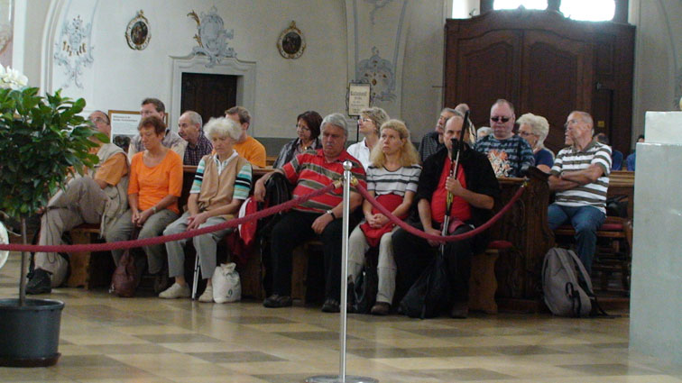 der Kirche, ein Pater erzählt ihnen die Geschichte der Wallfahrt und erklärt