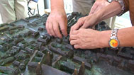 An einem Bronzemodell der Stadt können die Pitschedabber mit den Händen