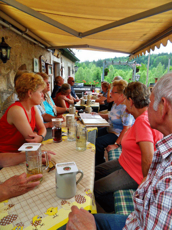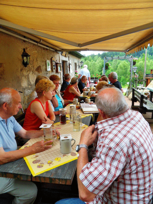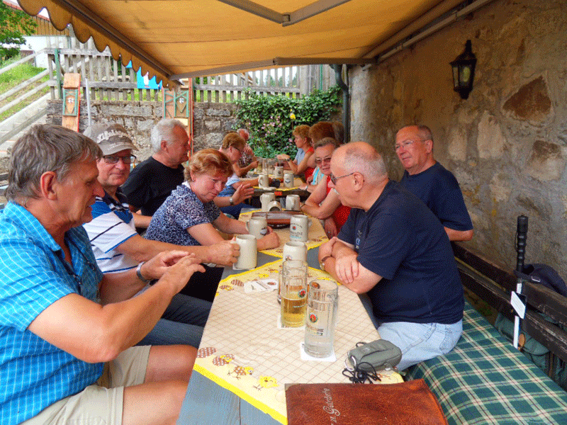 Für die ca. dreieinhalbstündige Anreise waren Fahrgemeinschaften gebildet worden und am Samstag, 16.06.2012, um die Mittagszeit kamen alle 14 Teilnehmer in Utes Pension, unserer Herberge, an. Am Nachmittag wurde noch ein ca. einstündige Rundwanderung gemacht, bevor die Pitschedabber im, der Pension gegenüberliegenden "Kastanienhof" zu einem ersten Umtrunk eintrafen.