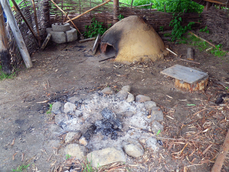 dem Lehmofen (4), der eine halbrunde Form hat und direkt auf dem Boden steht,