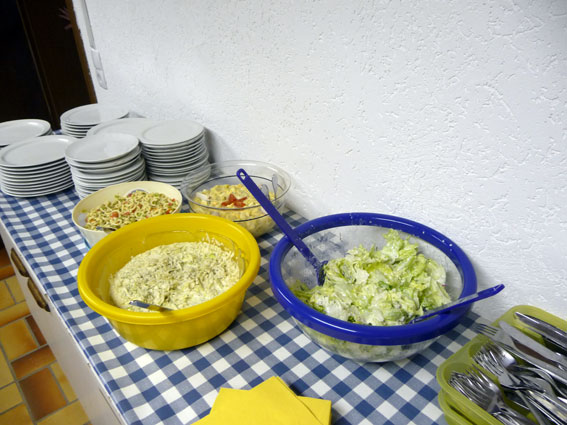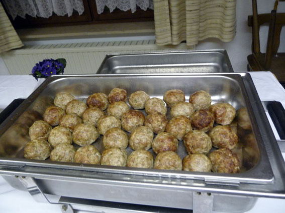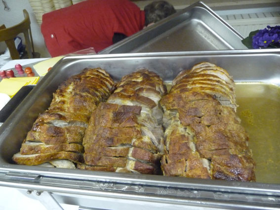 Und das war das Mittagessen: Fleischklopse, Schweinebraten, Käse und Salate.
