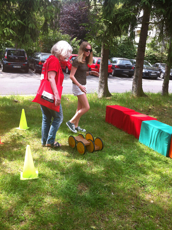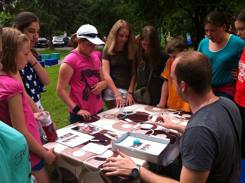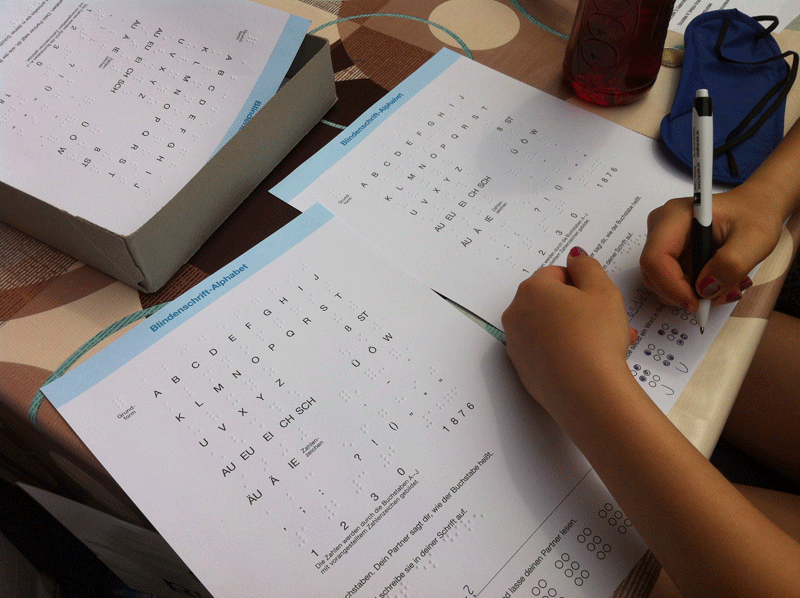Die Organisatoren hatten verschiedene Stationen vorbereitet, die die jungen Leute spielerisch durchliefen: eine allgemeine Information mit Fragen wie z.B. "Wie verhältst du dich, wenn du einen Blinden auf der Straße triffst?" Sie konnten als Antwort unter 4 Antworten auswählen. An einem anderen Stand lernten sie die Brailleschrift kennen, an einem dritten verschiedene Spiele, die speziell für Nichtsehende adaptiert worden waren. An einem vierten Stand sollte man an Hand des Geruchs die Inhalte von Dosen erraten und an einem fünften mit verbundenen Augen und dem Blindenstock einen Parcours entlanglaufen. Außerdem hatten die Organisatoren ein Dunkelrestaurant eingerichtet, wo Josef den jungen Leuten Spaghetti und Limonade servierte.
