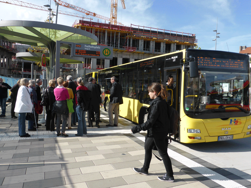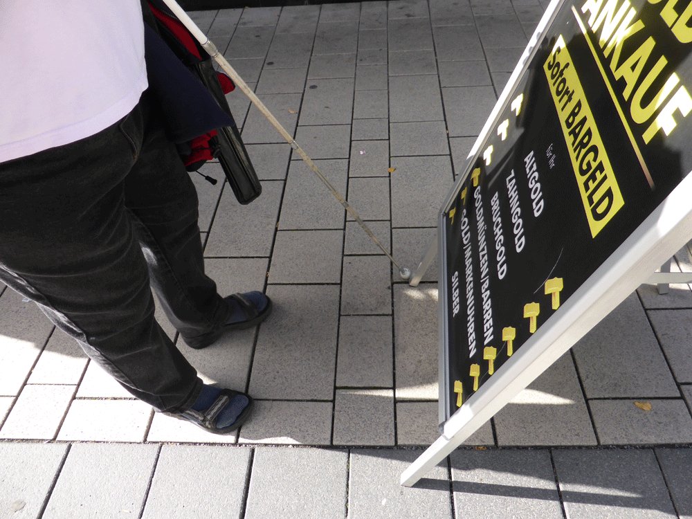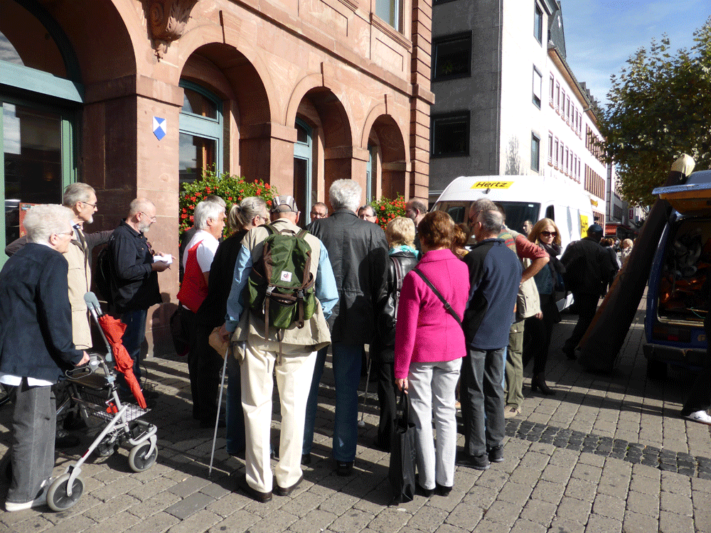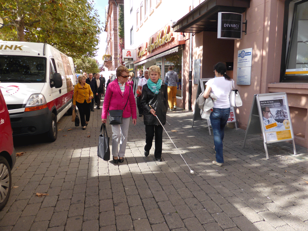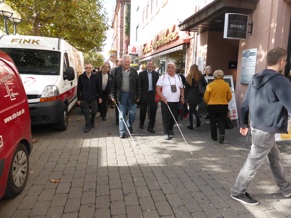 Zum "internationalen Tag des weißen Stockes", am 15.Oktober 2014, der sich in diesem Jahr zum 50. Mal jährte, trafen sich ca. 10 Mitglieder vor dem Rathaus am Markt mit Vertretern der Stadt und der Verkehrbetriebe. Vom Marktplatz gingen die Blinden dann mit ihrem Stock zum Freiheitsplatz und wiesen die offiziellen Vertreter bereits auf dem Weg auf Probleme hin, denen sie im Alltag beim Gang durch die Stadt begegnen, wie z.B. Werbeschilder, die vor den Geschäften auf dem Gehsteig stehen. Am Freiheitsplatz wurde dann der neue Busbahnhof begutachtet und inwieweit er die Auflagen der Barrierefreiheit erfüllt. Dabei stehen die in das Pflaster eingelassenen Rillenplatten als Leitsysteme und die Noppenplatten als Aufmersamkeitsfelder im Fokus. Lesen Sie dazu auch den Zeitungsartikel, der am 21.10.2014 im Hanauer Anzeiger erschien: Artikel im HA