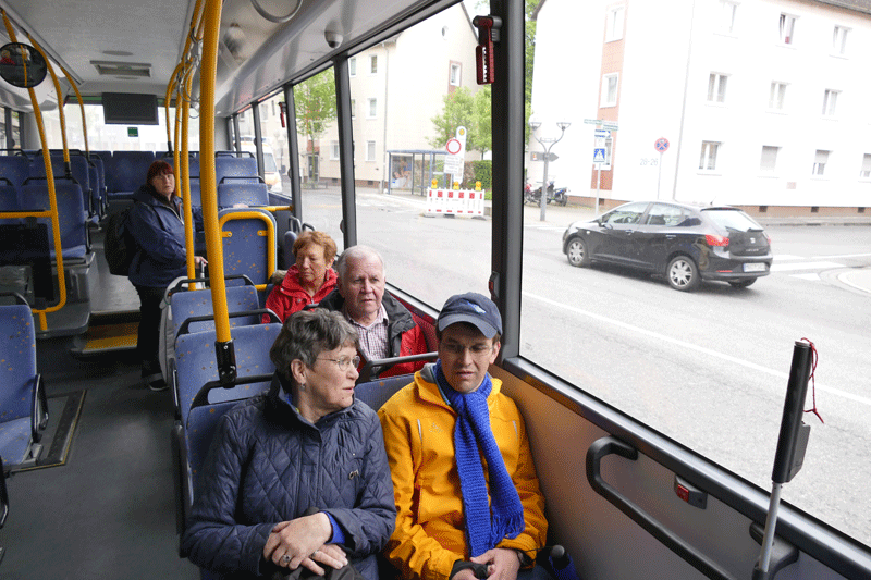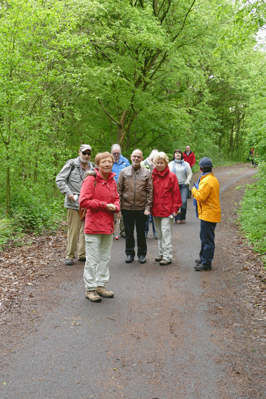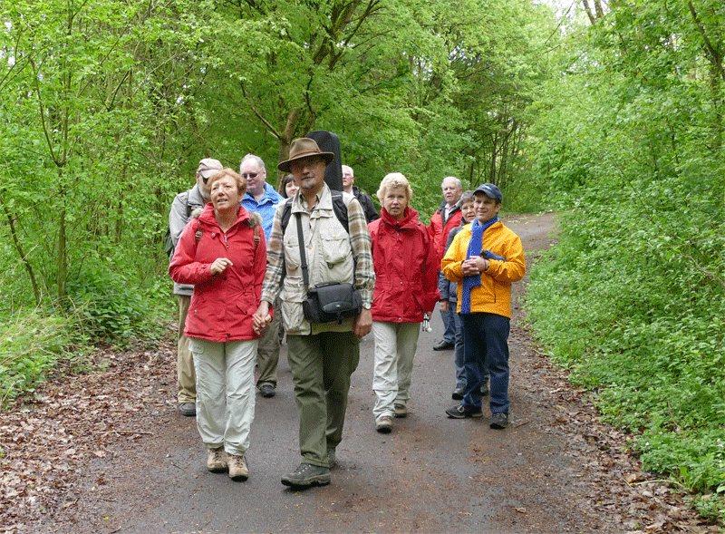 Am 1. Mai trafen sich um 9 Uhr 45 die Wanderer am Freiheitsplatz, um mit dem Bus zur Otto Hahn Schule zu fahren. Hier starteten sie ihren zweistündigen Spaziergang durch den Frühjahrswald. Er führte zunächst entlang der Bahnstrecke bis zum Bahnhof Willhelmsbad. Hier zwischen jungem Grün und dem Duft der Knoblauchrauke überraschten wir zwei Vergißmeinichtdiebe. Anstelle im Gartencenter zu kaufen bedienten sie sich ohne schlechtes Gewissen an den üppig blühenden Pracht. Vorbei ging es am Dröse Stadion über die Brücke der Schnellstraße zu den Anglerseen. Wir gelangten dann in das renaturierte Erholungsgebiet "Am Hochgericht" Ein schön angelegtes Gebiet mit Abenteuerspielplätzen für Junge und jung Gebliebene. Unserer Weg führte uns dann durch Kesselstadt den Weihergraben in die Milch und Punkt 12 Uhr zu Schilds Garten. Überall duftete es nach Flieder.