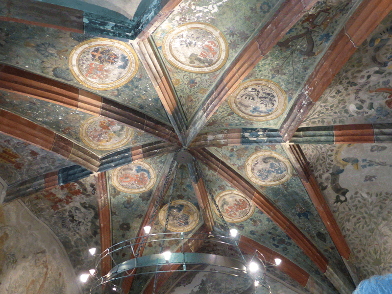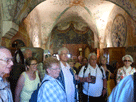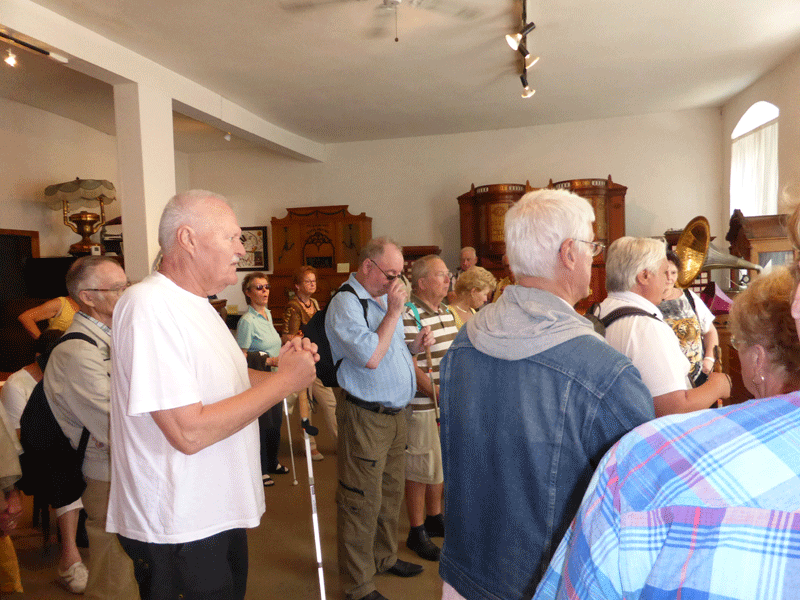 Wir sehen und hören noch so manche Kuriosität, u.a. Grammophone mit riesigen Schalltrichtern und ein Orchestrion mit sich bewegenden Puppen, Menschen und Affen darstellend. Wir besuchen auch den ältsten Teil des Brömserhofs mit beeindruckenden Malereien an den Gewölbedecken und Wänden.