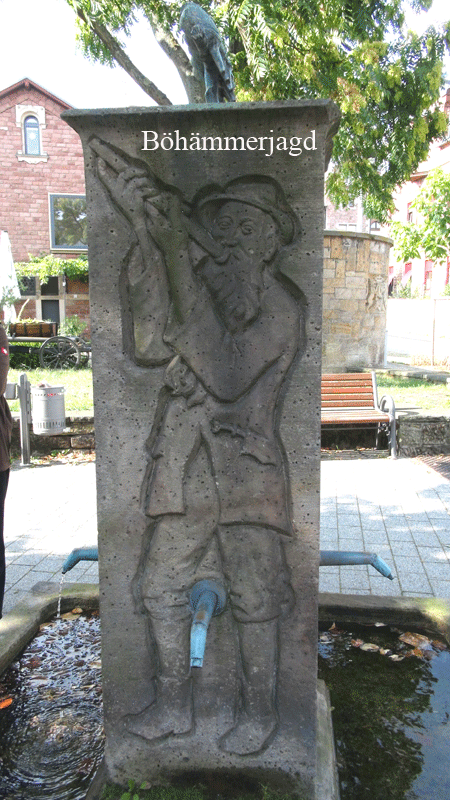 Der Böhämmerbrunnen erinnert an die Tradition der Böhämmerjagd, eine Tradition, die bis zum Beginn des 20.Jh. in Bergzabern und Umgebung gepflegt wurde. Im Winter wurden die in großen Schwärmen in die Wälder einfallenden Bergfinken, hier Böhämmer genannt, mittels eines Blasrohrs erlegt. Der im Sommer in den nordischen Ländern beheimatete Bergfink zieht im Winter in großen Schwärmen nach Mitteleuropa und bevorzugt des Nahrungsangebots wegen Wälder mit Buchenbeständen, wie sie im Pfälzerwald reichlich vorhanden sind. Die Tiere haben die Eigenschaft, nachts dicht gedrängt in einer Reihe zu schlafen. Fällt ohne größeres Aufsehen plötzlich eines aus dieser Reihe, rücken die übrigen nach und schließen die Lücke. Die Böhämmerjagd war zum einen eine beliebte Männerbeschäftigung in den Wintermonaten, zum anderen diente sie aber auch der Bereicherung des Speisezettels. Die Böhämmer wurden vor allem gebraten gegessen. In ertragreichen Jahren wurden erlegte Vögel sogar an Fremde verkauft.