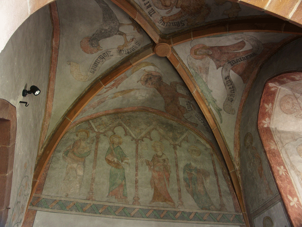 aus der Entstehungszeit der Kirche. Ausgeschmückt ist der Chorraum mit