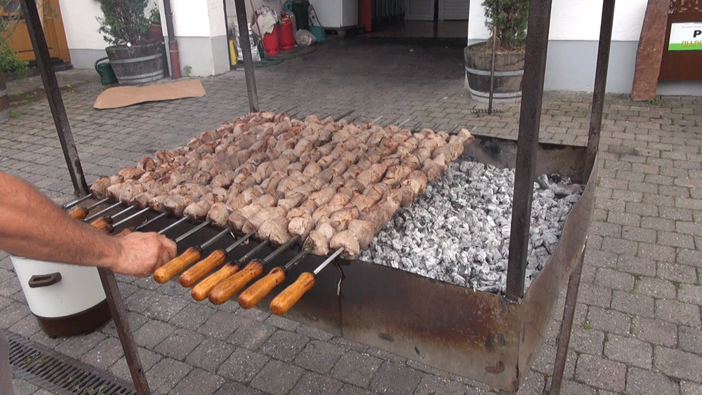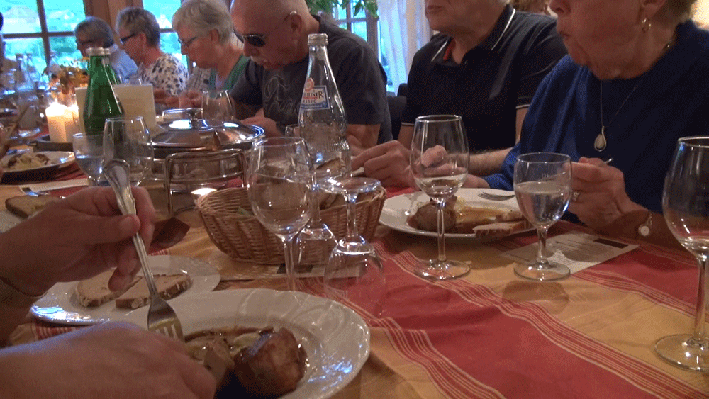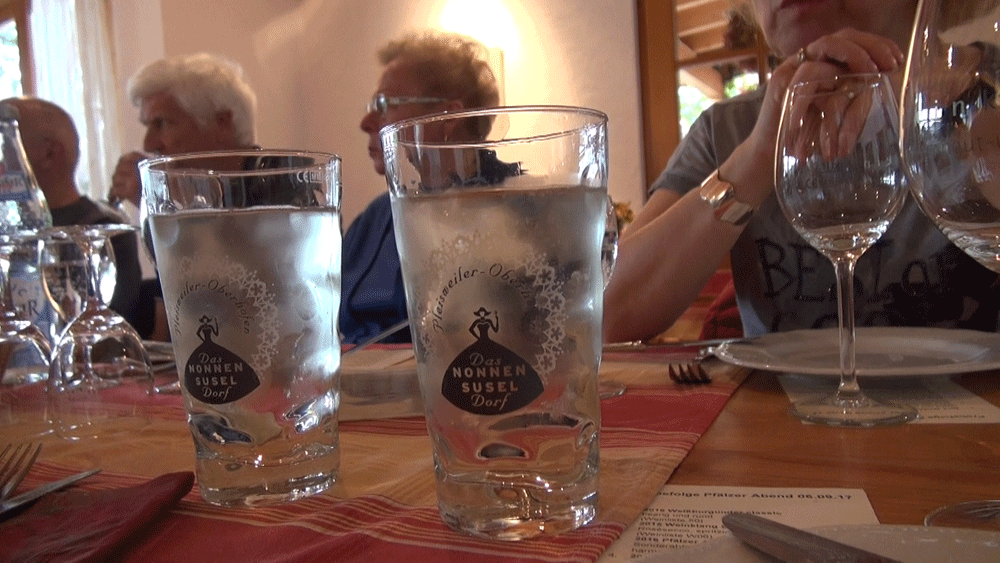 Am Abend steht dann noch einmal Wein auf dem Programm, ein "Pfälzer Abend" mit Weinprobe im Weingut Ullrich. Im Freien liegt der Pfälzer Spießbraten, im Volksmund "Rebknorzebrode" genannt auf dem Grill mit Rebenholz. Wir sitzen derweil gemütlich in der Gaststube an einem langen Tisch und werden schon einmal mit Getränken versorgt. Dazu gibt es Schmalzbrot. Wir bekommen 5 verschiedene Weine eingeschenkt und dazu gibt es den vorzüglichen "Rebknorzbrode".