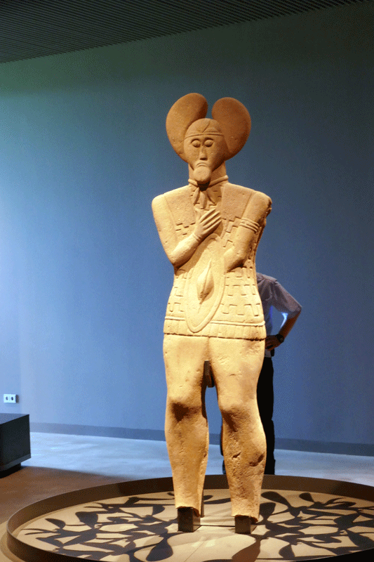 Und dann kommen wir zum berühmtesten Ausstellungsstück, das man in der Grabanlage gefunden hat, die überlebensgroßen Steinfigur eines (vermutlich) Kriegers. Die bis auf die Füße vollständig erhaltene Statue ist mit einer haubenartigen Kopfbedeckung versehen, die als (Mistel-)Blattkrone gedeutet wird und als Grabbeigabe in Grab 1 gefunden wurde. Diese Figur des „Keltenfürsten vom Glauberg“ ist bislang der bedeutendste Fund der Latènekultur (ca. 450 v. Chr. bis zur Zeit um Christi Geburt) in Hessen und wurde am 24. Juni 1996 geborgen.