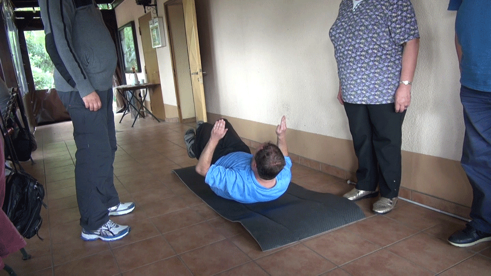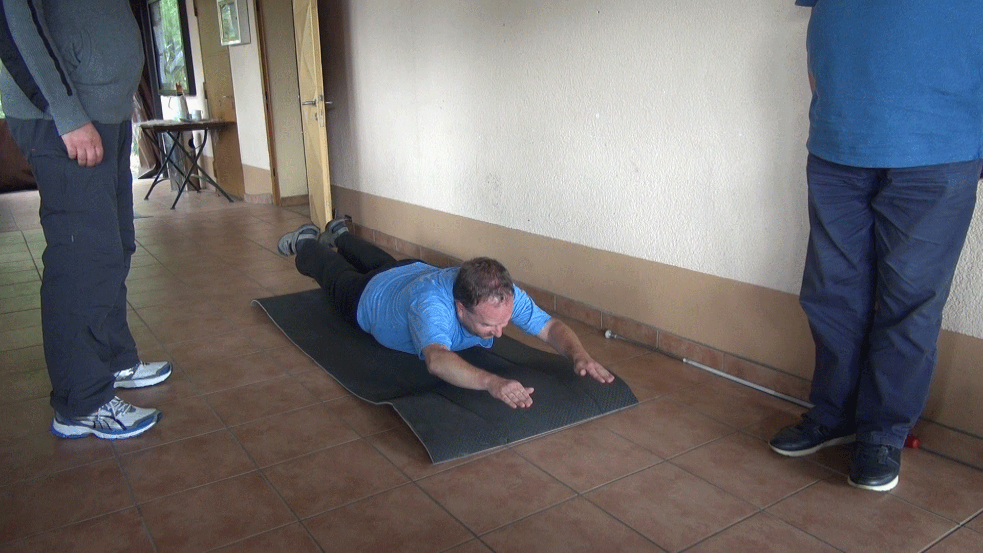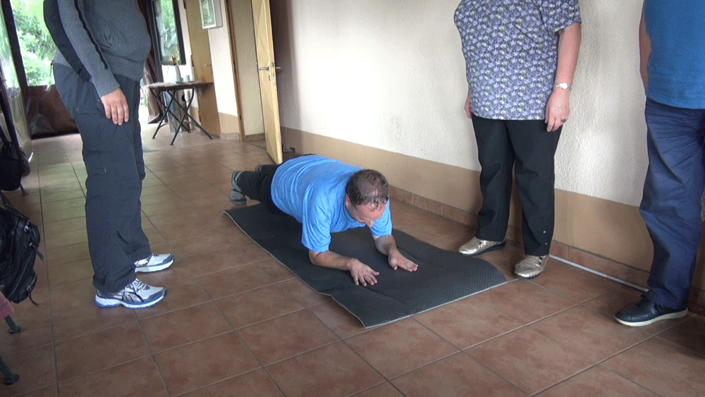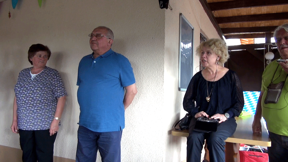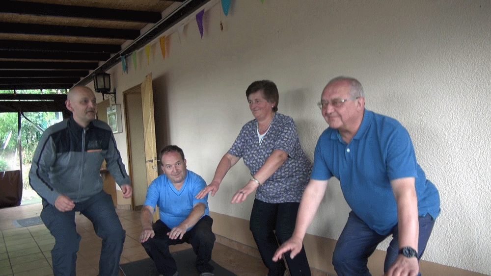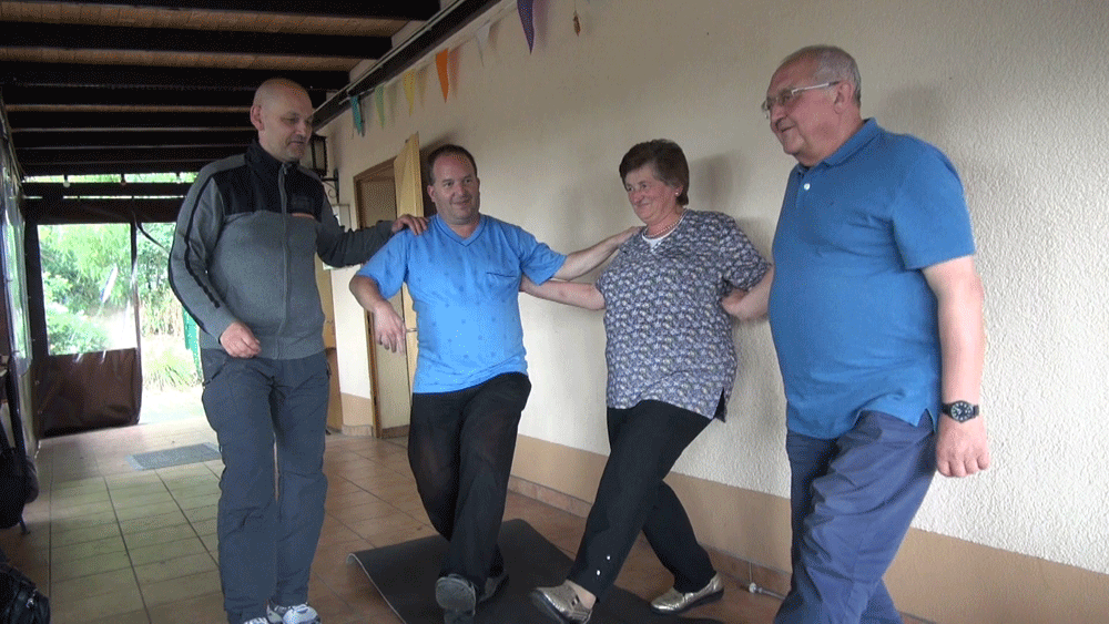 Silvia berichtete von der Workout-Gruppe, die sich jeden Mitwoch im Bewegungsraum der Martin-Luther-Stiftung trifft, um sich fit zu halten, denn workout heißt auf deutsch einfach Fitnesstraining. Übungsleiter Rüdiger war auch gekommen und wurde für sein ehrenamtliches Engagemant gewürdigt. Marc, Ingo, Franz und Margit führten die Übungen vor, von denen in ihrem Vortrag die Rede ist. Silvia konnte noch nicht mitmachen, denn nach einer Fußoperation, konnte sie noch nicht lange stehen, geschweige denn Fitnessübungen machen. Deswegen saß sie auf einem Tisch daneben.