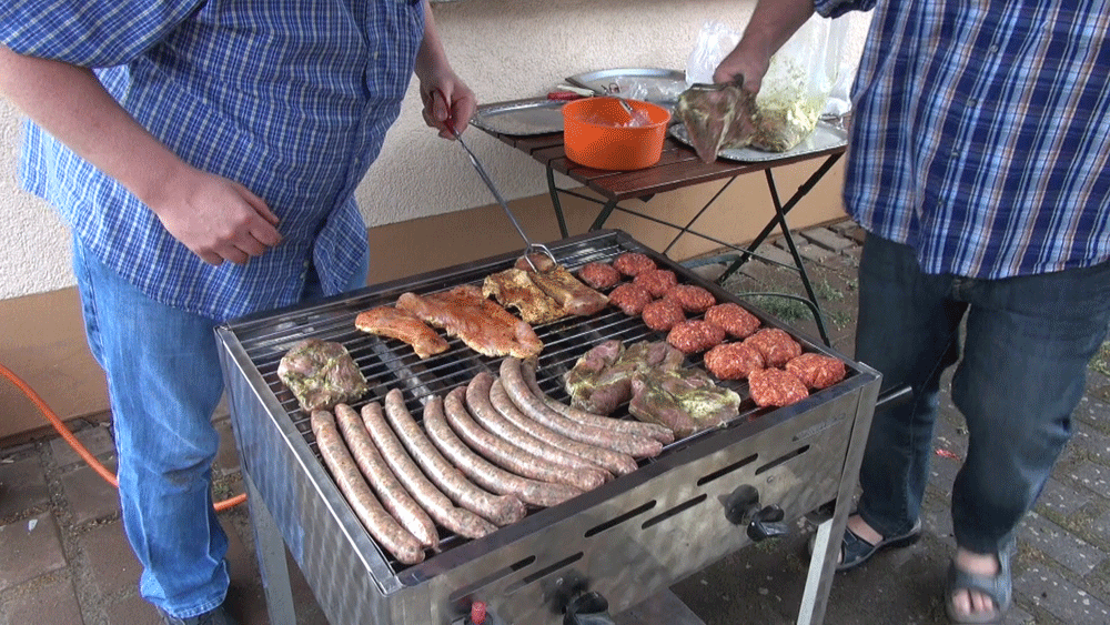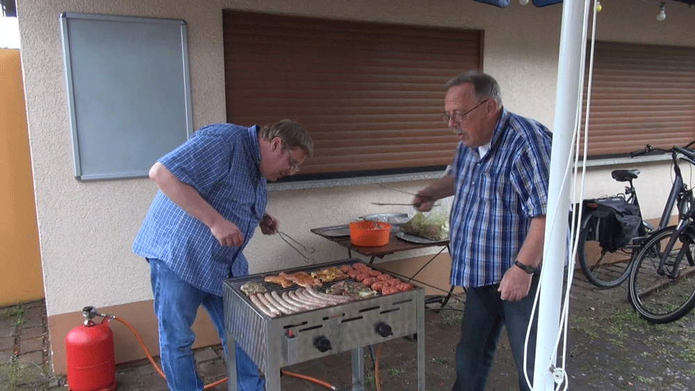 Langsam war es Abend geworden und Andreas machte sich daran, den Grill anzuzünden. Dabei wurde er tatkräftig von Rainer unterstützt. Die Salate fürs Buffet waren auch von Teilnehmern zubereitet worden.