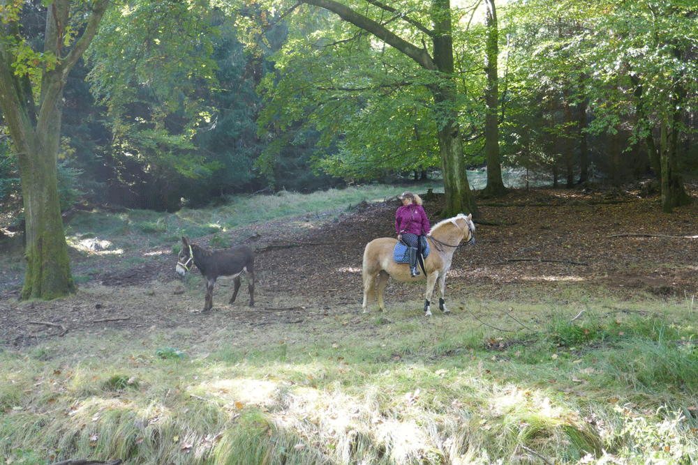 das spätsommerliche Herbstwetter, eine Frau auf einem Pferd mit einem Esel