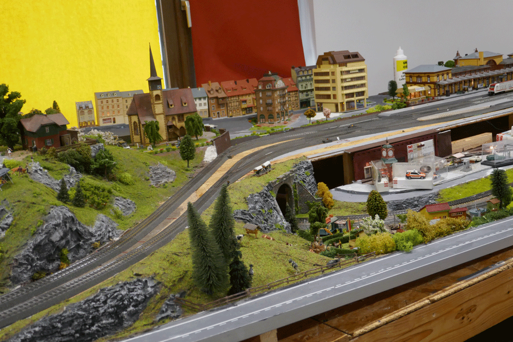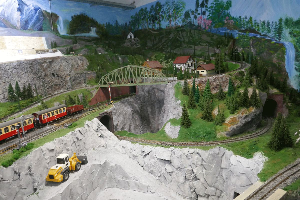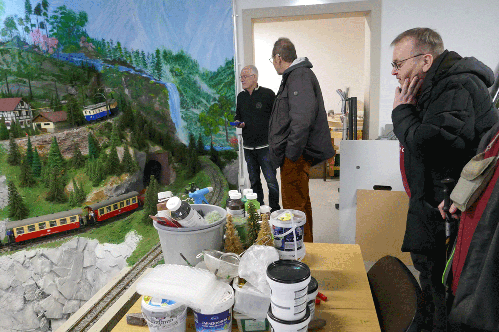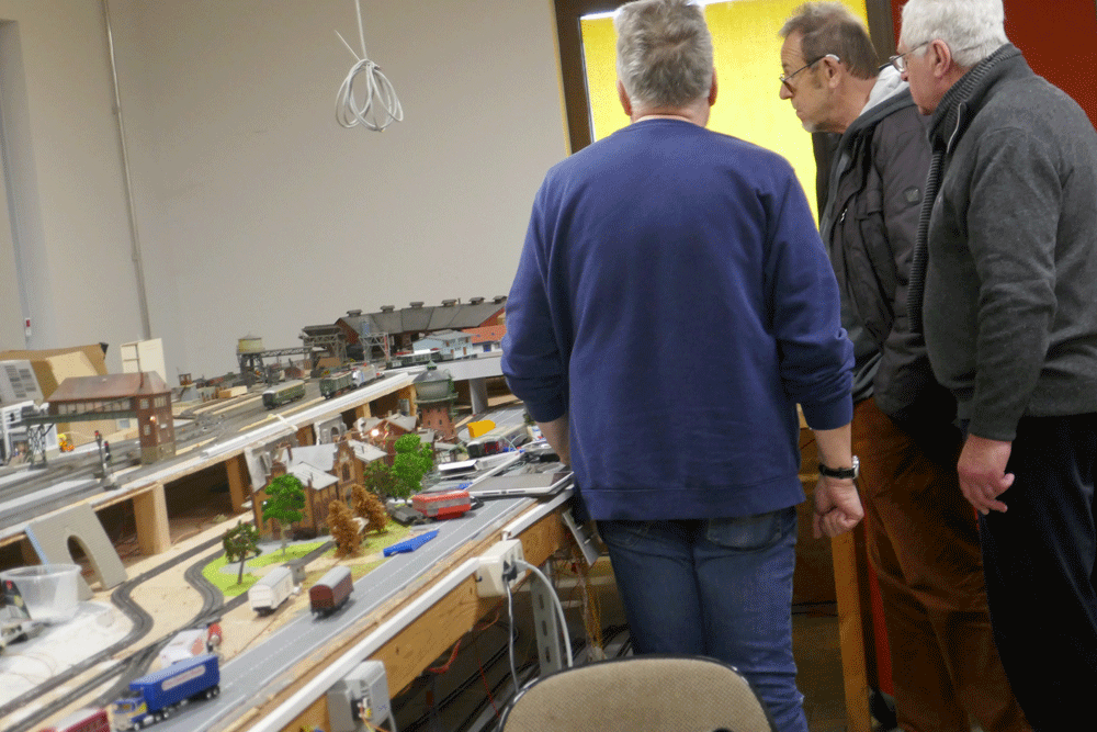 Als letztes besucht unsere Gruppe die Anlagen der Eisenbahnfreunde, die riesige Modelleisenbahnanlagen aufgebaut haben und immer noch daran arbeiten. Dabei geht es nicht nur um die Eisenbahnen, sondern auch um die Landschaften drum herum. Alles wird liebevoll gestaltet mit Dörfern, Bäumen, Straßen, Tunnel und vielen anderen Details.