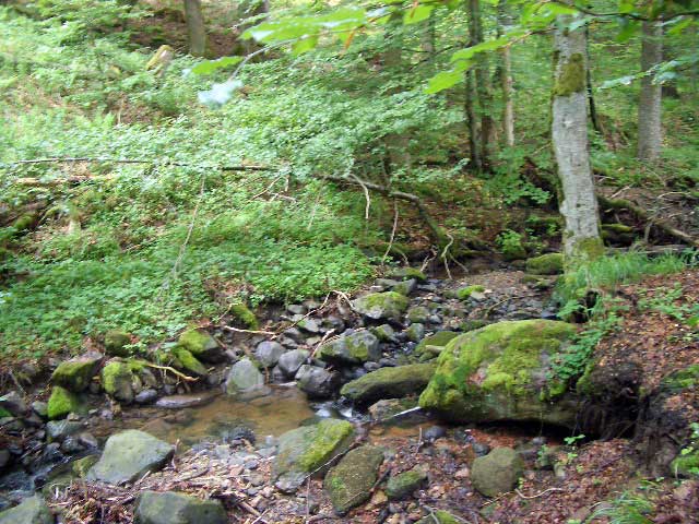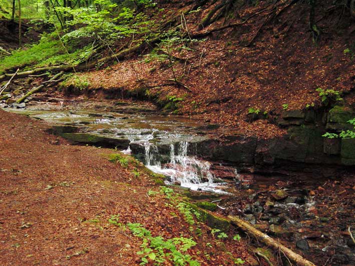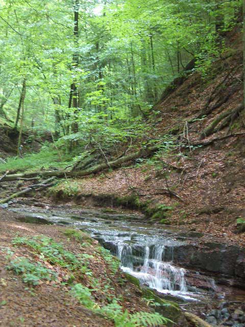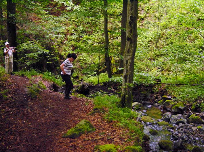 Am Pfingstsonntag sind dann noch zwei Pitschedabber zu uns gestoßen: Angela und Bernd. Die Wanderung führte über die Kaskadenschlucht nach Gersfeld. Ein Teil der Gruppe lief am Rand der Schlucht entlang, denn der Weg durch die Schlucht ist teilweise schwierig. Am Ende der Schlucht trafen sich die Gruppen wieder in Sandberg im Biergarten "Stefanie", wo es ein gutes Bier vom Kloster Kreuzberg gab.