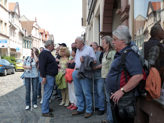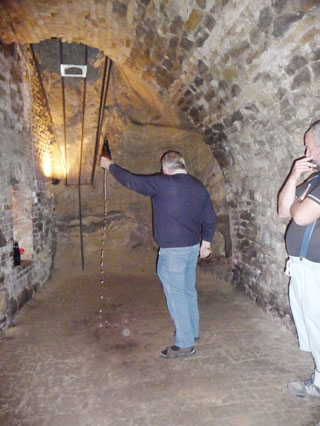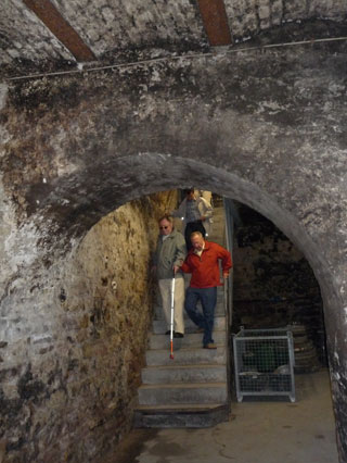 Das nächste Ziel von Herrn Gillots Führung ist der Eiskeller. Wir treten in das Oppenheimer Kellerlabyrinth ein. Ein verwobenes Keller-Labyrinth zieht sich durch das komplette historische Zentrum der Stadt. Wer die etwa 500 Keller einst in den Lössboden hineintrieb, ist bis heute ebenso wenig bekannt, wie die genaue Entstehungszeit. Wahrscheinlich dienten die ersten unterirdischen Gänge bereits im 13. Jahrhundert als Lagerräume. Damals lag Oppenheim am Kreuzpunkt wichtiger Handelsstraßen. Tief unten im sog. Eiskeller erzählt uns Herr Gillot von der Geschichte der Stadt, von den kannibalischen Exzessen des 30-jährigen Krieges und von den Gräueltaten der Franzosen unter Ludwig XIV, als die Franzosen im Pfälzischen Erbfolgekrieg 1689 die Stadt völlig zerstörten. Am tiefsten Punkt der Stadt ergreift Herr Gillot das "Hugenottenschwert" und schlägt eine Flasche mit blutrotem Sekt den Kopf ab. Herr Gillot ist selbst Nachfahre der Hugenotten, die unter Ludwig XIV verfolgt wurden. Den abgeschlagenen Sektflaschenkopf überreicht Herr Gillot dann auch mit den Worten: "Der Kopf Ludwigs XIV." Wir werden dann durch die Stadt geführt und Herr Gillot erzählt uns noch die eine oder andere Geschichte.