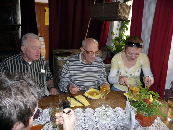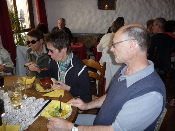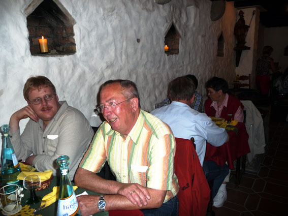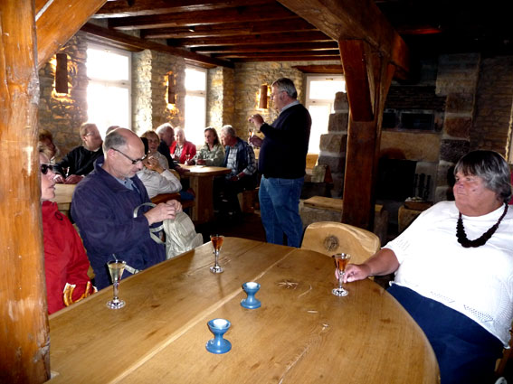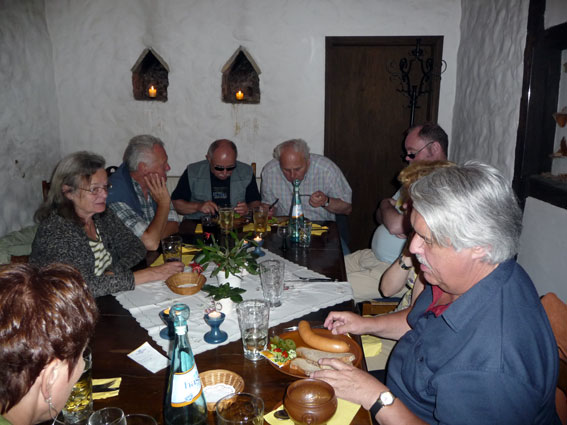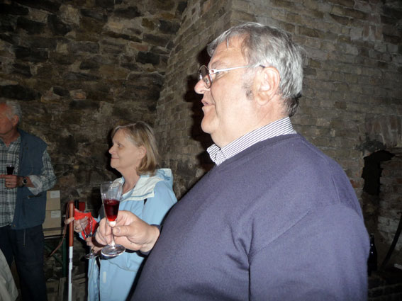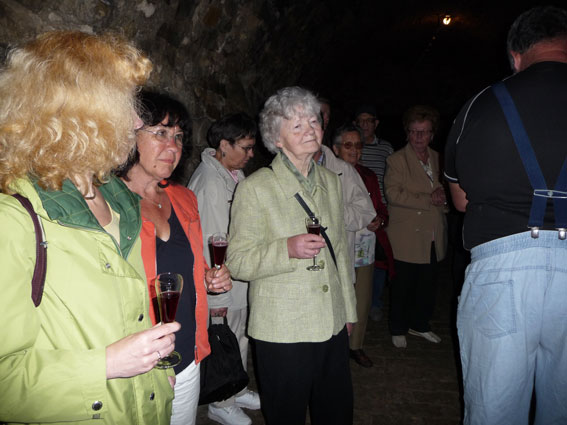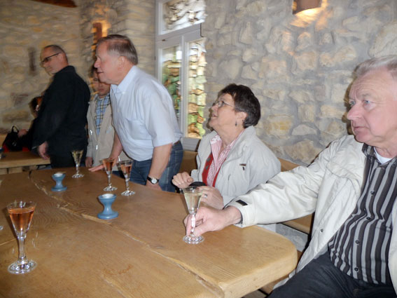Nach der Kellereibesichtigung nehmen wir im "Vogelfelsen" an einer Sektprobe teil. So wird das steinerne, mittelalterliche Haus genannt, das Herr Gillot wiederaufgebaut hat und um das sich eine Legende gebildet hat, die sie unter http://www.gillot.de nachlesen können. Dabei sitzen wir an schweren Eichentischen.