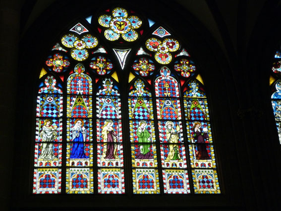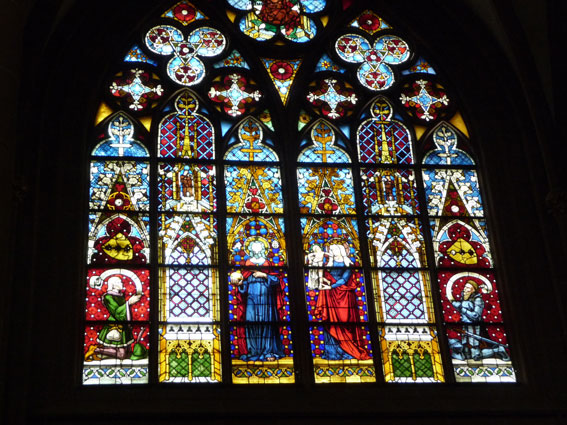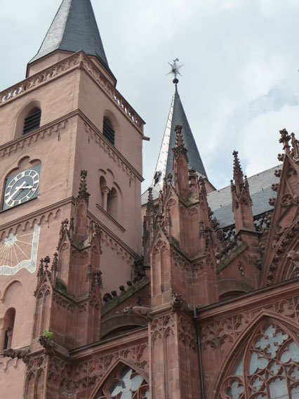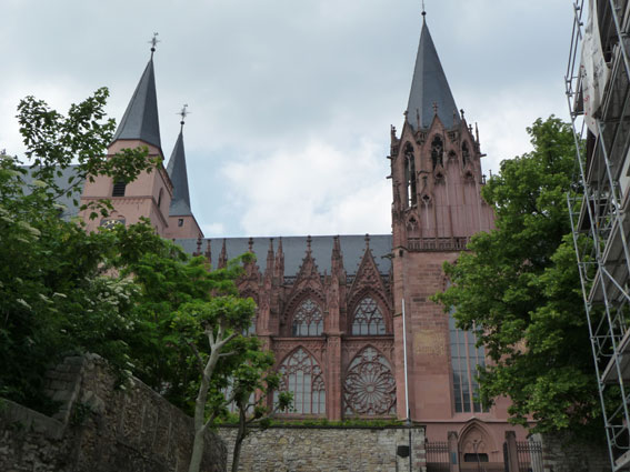 Am Nachmittag, bevor wir dann wieder nach Hause fahren, zeigt uns der Sohn unseres Mitgliedes Reinhilde noch die Besonderheiten des gotischen Oppenheimer Doms. Ihr Bau wurde um 1220 begonnen und 1439 beendet. Die verschiedenen Baustile sind deutlich erkennbar an den beiden romanischen Türmen (begonnen um 1220), dem früh-gotischen Ostchor und Querschiff (begonnen 1262), dem hochgotischen Langhaus mit Seitenschifften (1327-1370) und dem spätgotischen Westchor (1415-1439). Berühmt sind auch die schönen gotischen Glasfenster.