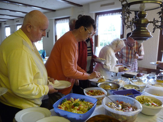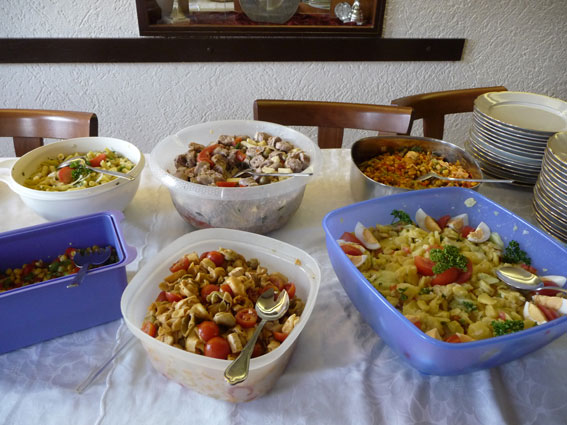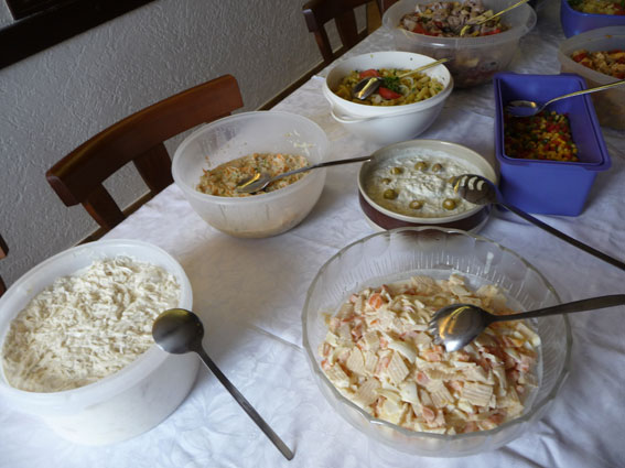 Zum Abendessen hatten die Mitglieder viele verschiedene Salate mitgebracht und Achim hatte im heimischen Herd einen köstlichen Hackbraten und mehrere Portionen Fleischkäse zubereitet.