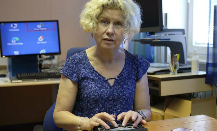 demonstriert den elektronischen Organizer mit Braille-Eingabe.